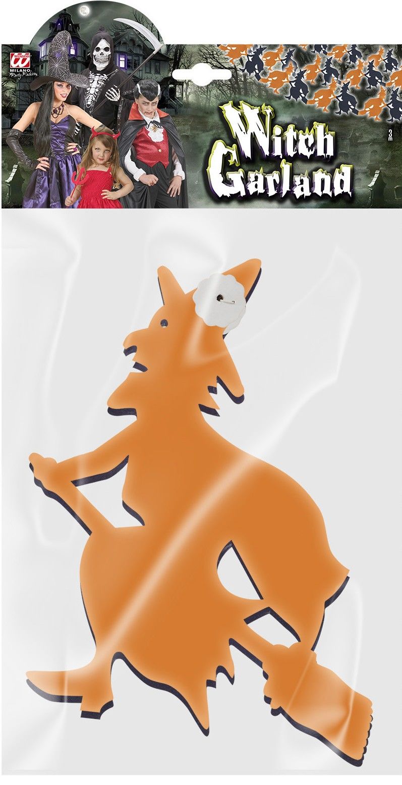 Pakken inneholder 1 stk 3 meter lang girlander med oransje og svarte hekser på sopelim, laget i papir
