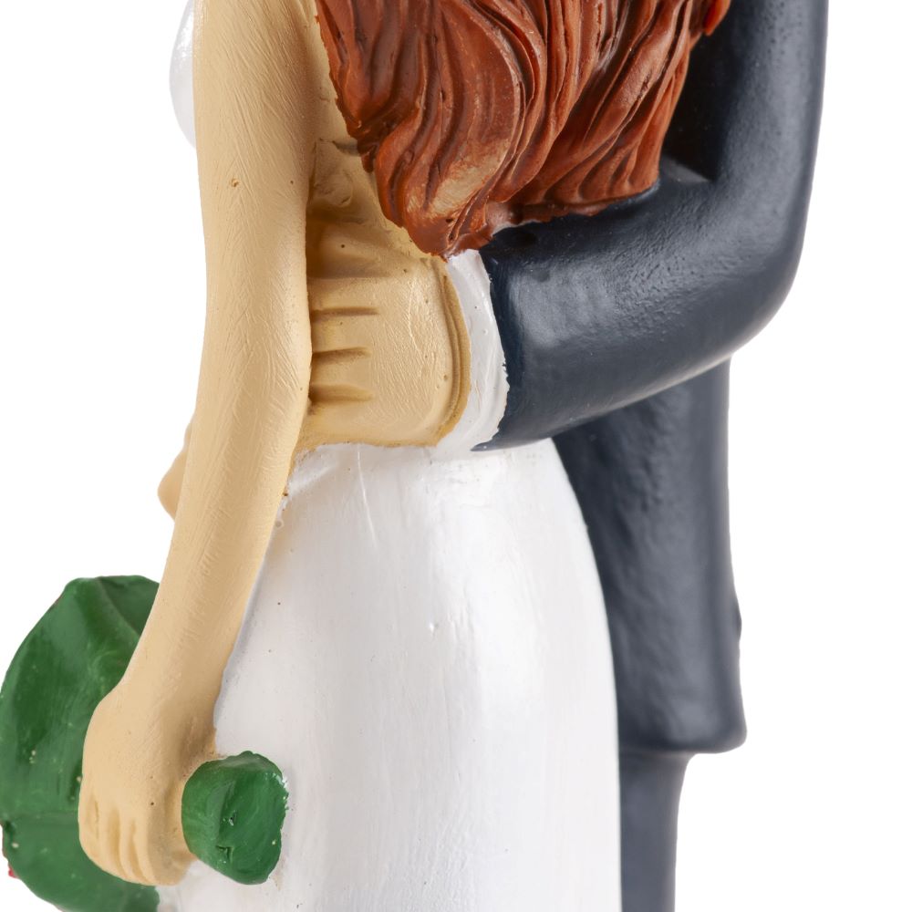 Kaketopp til bryllup med brudepar som holder hender. Kaketoppen er 18cm høy, og passer perfekt til standard bryllupskake. Bruden har hvit kjole og rød bukett og brudgommen har klassiske svart dress. En bryllupskaketopp som skaper et tidløst uttrykk som vil passe perfekt til enhver bryllupskake.