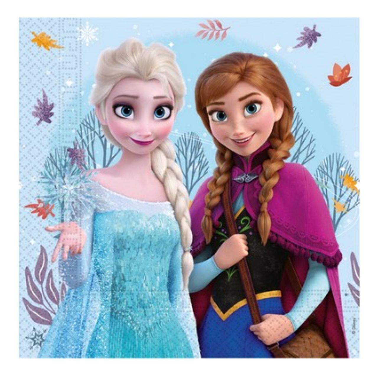 Servietter dekorert med figurer fra Disneyfilmen Frost eller Frozen. Pakken inneholder 20 servietter, og disse er i standard størrelse, 33x33cm når de er brettet helt ut.